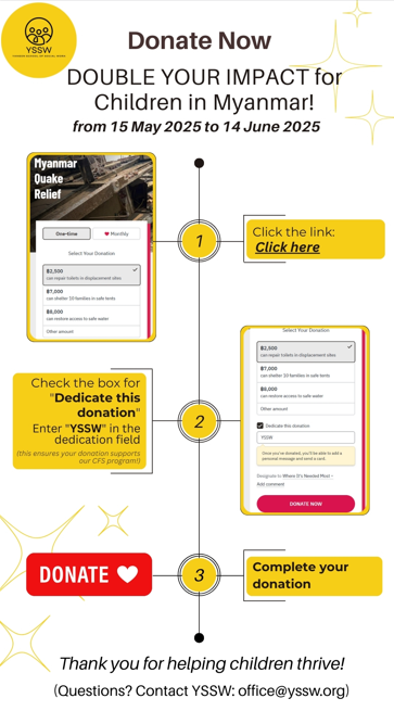 နိုင်ငံတကာမှ လှူဒါန်းလိုပါက: Link မှ လှူဒါန်းနိုင်ပါတယ် – Click This Link ( "Dedicate this donation" အကွက်ကို အမှန်ခြစ် ခြစ်ပြီး YSSW ဟု ဖြည့်ရန်မမေ့ပါနှင့်!)