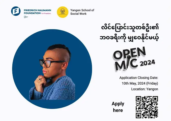 Open Mic နဲ့ ပတ်သတ်ပြီး သိလိုတဲ့မေးခွန်းတွေရှိရင်လည်း Yangon School of Social Work Facebook Page Messenger တိုက်ရိုက်ဆက်သွယ်မေးမြန်းနိုင်ပါတယ်။