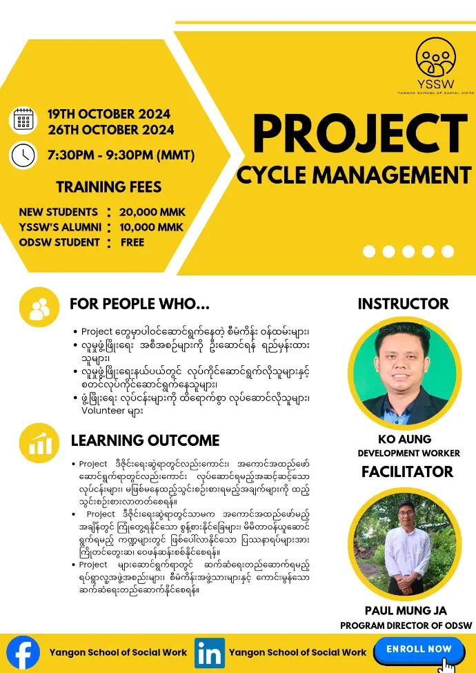လူမှုဖွံ့ဖြိုးရေးစီမံကိန်းများနဲ့ပတ်သတ်လို့ အစီအစဉ်ရေးဆွဲစီမံခန့်ခွဲခြင်း၊ ဖွံ့ဖြိုးရေးနှင့်ရပ်ရွာ အသိပညာပေးခြင်း၊ အမျိုးသမီးများအား ခေါင်းဆောင်မှုစွမ်းရည်မြှင့်တင်ခြင်းအပြင် အမျိုးသမီးများလိုအပ်တဲ့ ဝန်ဆောင်မှုများကို လက်လှမ်းမှီအောင်ဆောက်ရွက်ခြင်း စတဲ့ Social Work နယ်ပယ်မှာ ဆယ်စုနှစ်တစ်ခုကြာ လုပ်ဆောင်နေခဲ့၊လုပ်ဆောင်နေဆဲဖြစ်တဲ့ Instructor ကိုအောင် နဲ့အတူ Facilitator အဖြစ် Yangon School of Social Work (YSSW) ရဲ့ Online Diploma in Social Work ရဲ့ Program Director ဆရာ Paul Mung Ja တို့က ဦးဆောင်သင်ကြားပေးသွားမှာဖြစ်ပါတယ်