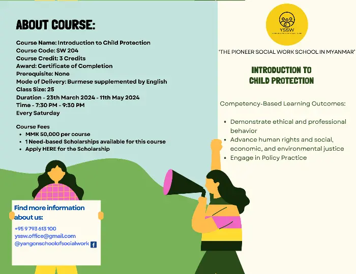 ယနေ့မှာတော့ Yangon School of Social Work ရဲ့ Wave 6 မှာ ဖွင့်လှစ်မယ့် Introduction to Child Protection (SW 204) ဘာသာရပ်အကြောင်းကို မိတ်ဆက်ပေးလိုက်ပါတယ်။